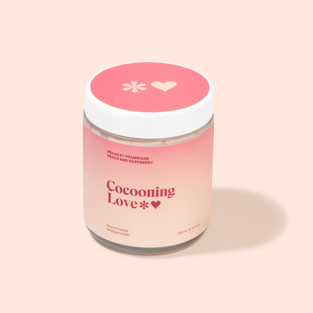 Fondez pour ce beurre corporel au parfum fruité de pêche et de framboise qui hydratera votre peau en profondeur et la laissera douce et parfumée. Fait à la main à Montréal, ce produit est également végane.