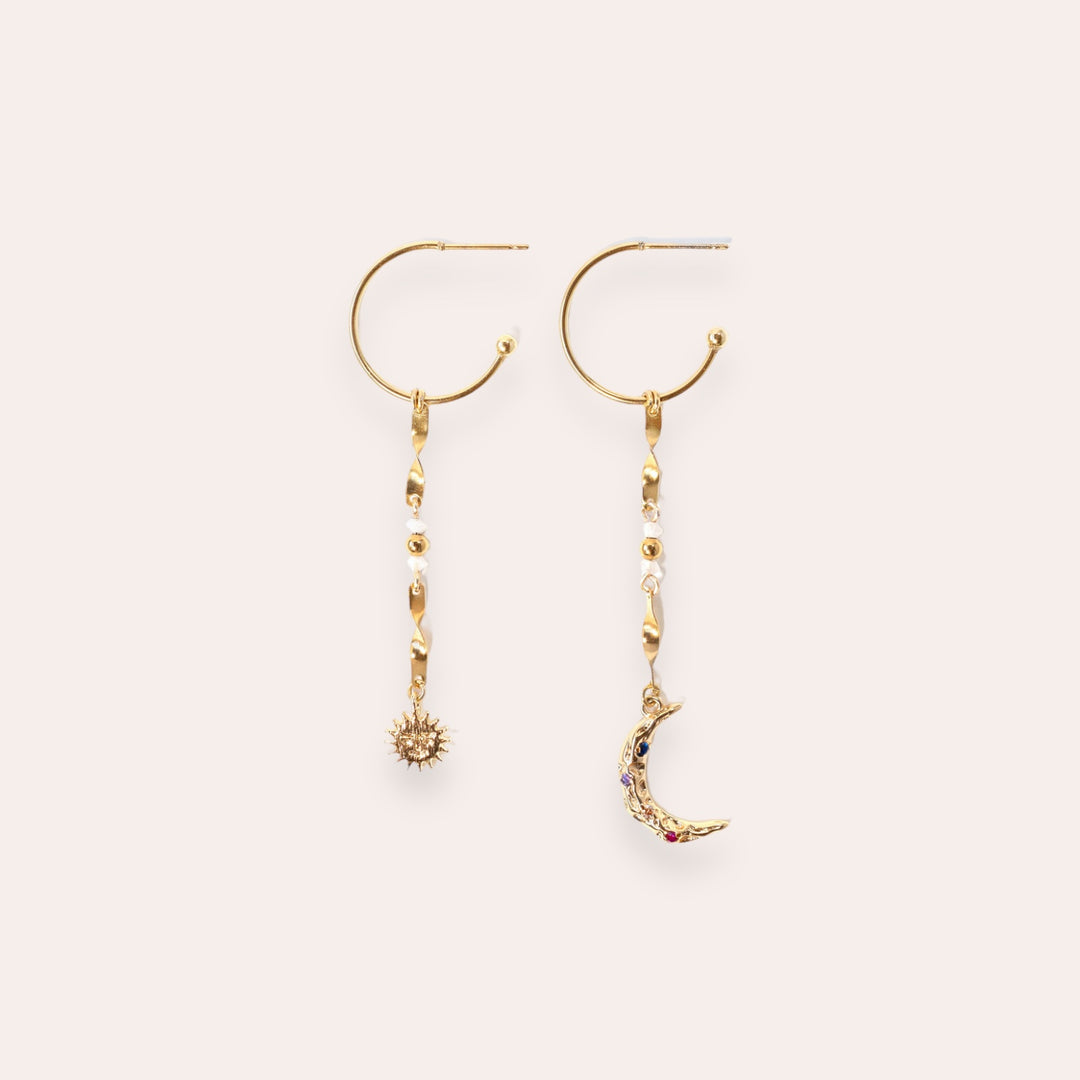 Pour embellir vos journées et vos soirées, portez les boucles d'oreilles asymétriques Minuit. D'un côté le soleil, de l'autre, la lune!