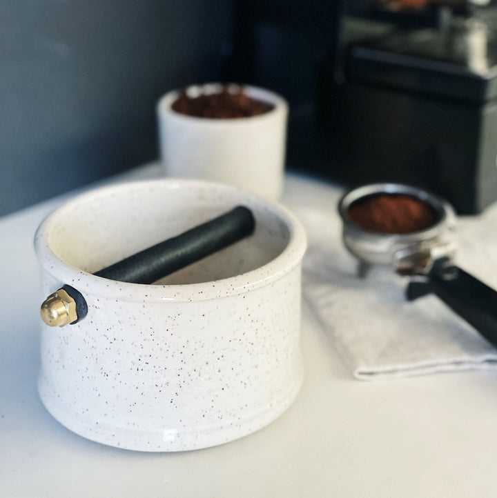 Ajoutez une touche professionnelle à votre comptoir de cuisine avec ce "knock box" en céramique ! Parfait pour les baristas en herbe ou confirmé.es, ce contenant à marc de café est très pratique au quotidien pour vider le porte-filtre des machine à café espresso.