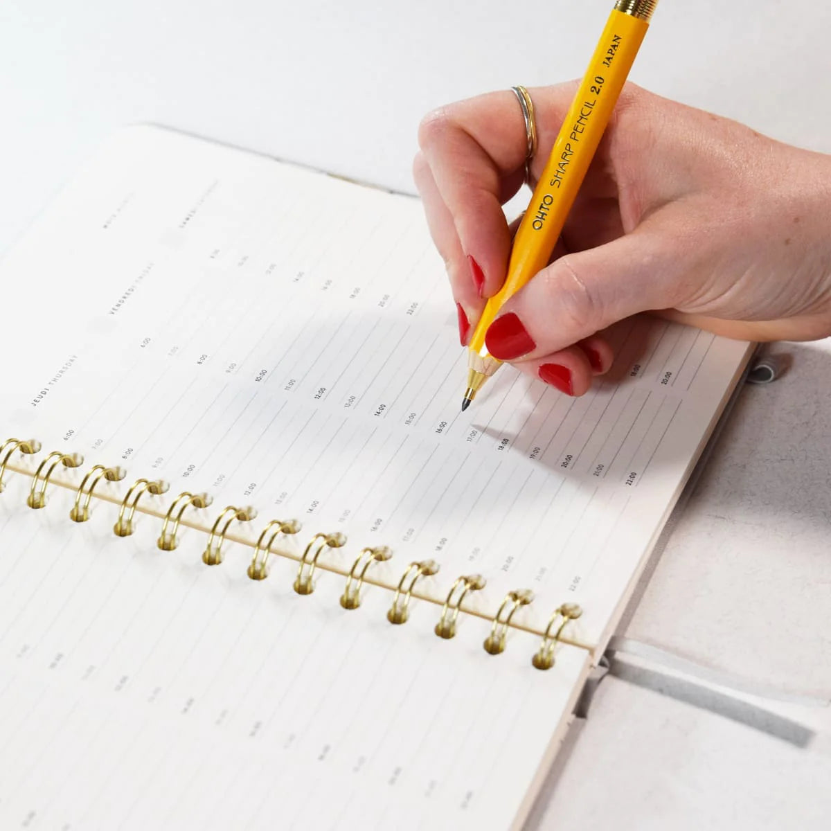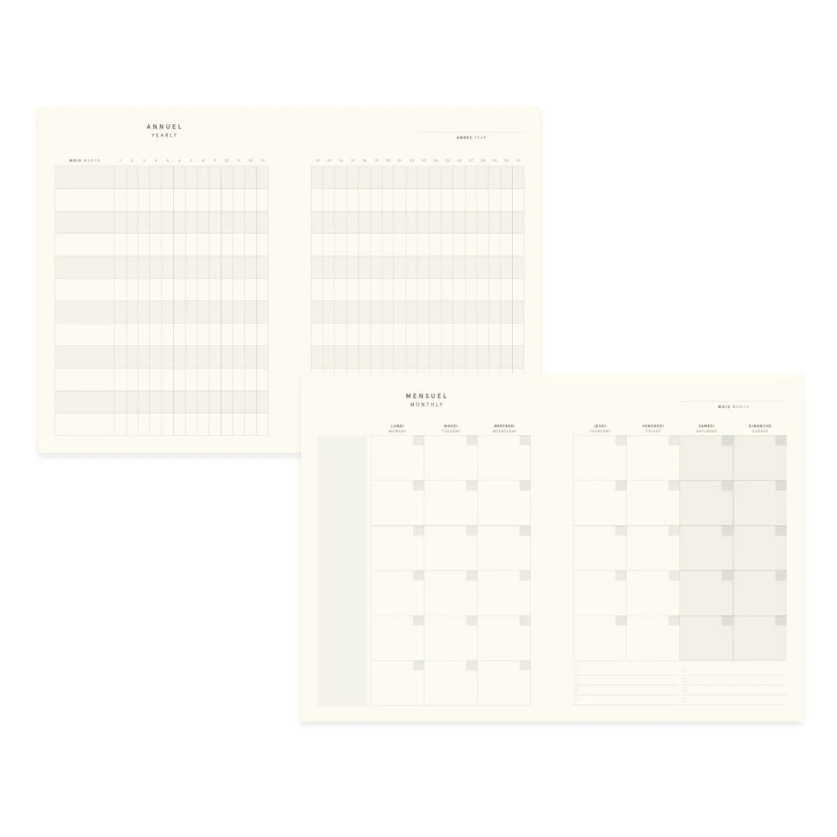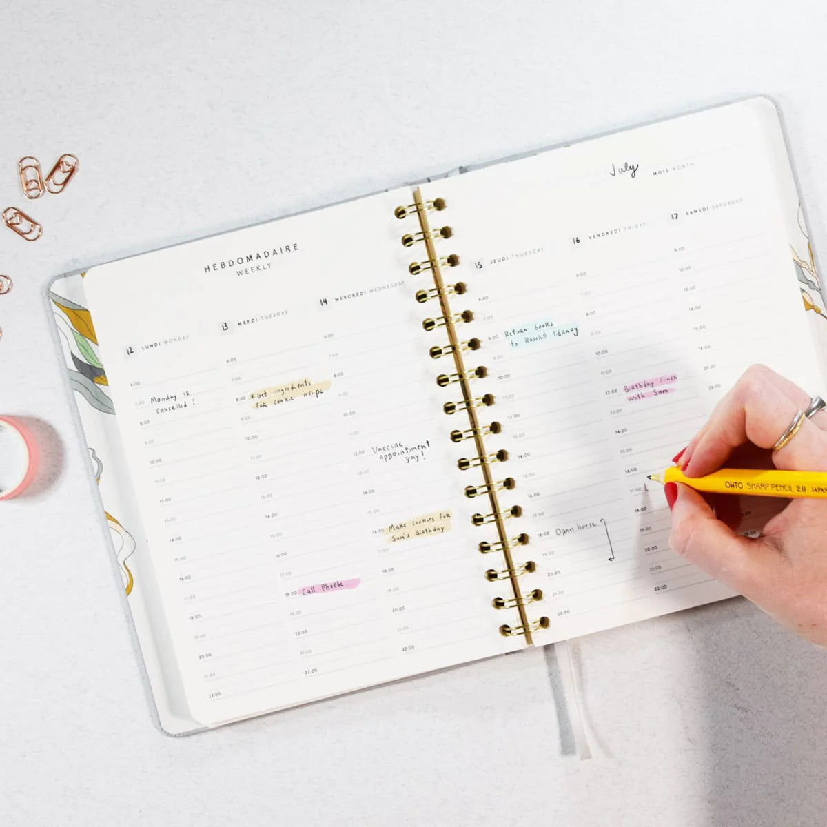 À l’intérieur : calendriers annuel et mensuels, planification hebdomadaire sur deux pages, listes à cocher, suivi des habitudes, illustrations mensuelles en couleur, pages «objectifs et réflexions », pages de notes, pochette arrière et ruban marque-page.