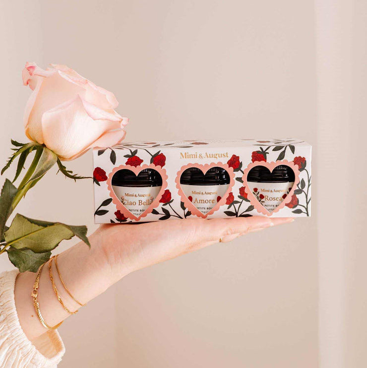 The Romance gift set includes three 2oz candles with unique fragrances: Amore: A delicate blend of white tea, grapefruit and rose petals. A sweet and fresh scent, delicately romantic, which envelops the space in a warm and tender atmosphere.