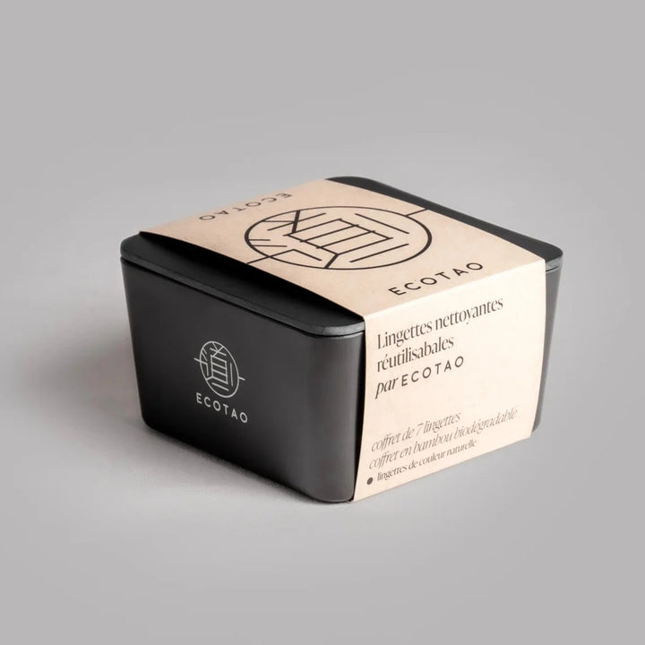 Box of 7 reusable bamboo and organic cotton wipes. The wipes have a rougher side for deeper cleaning and an ultra soft side for the most sensitive skin. The set is offered in a biodegradable bamboo fiber box. Each wipe is hand-sewn in Montreal from a fabric made of bamboo and cotton, also woven in Montreal.