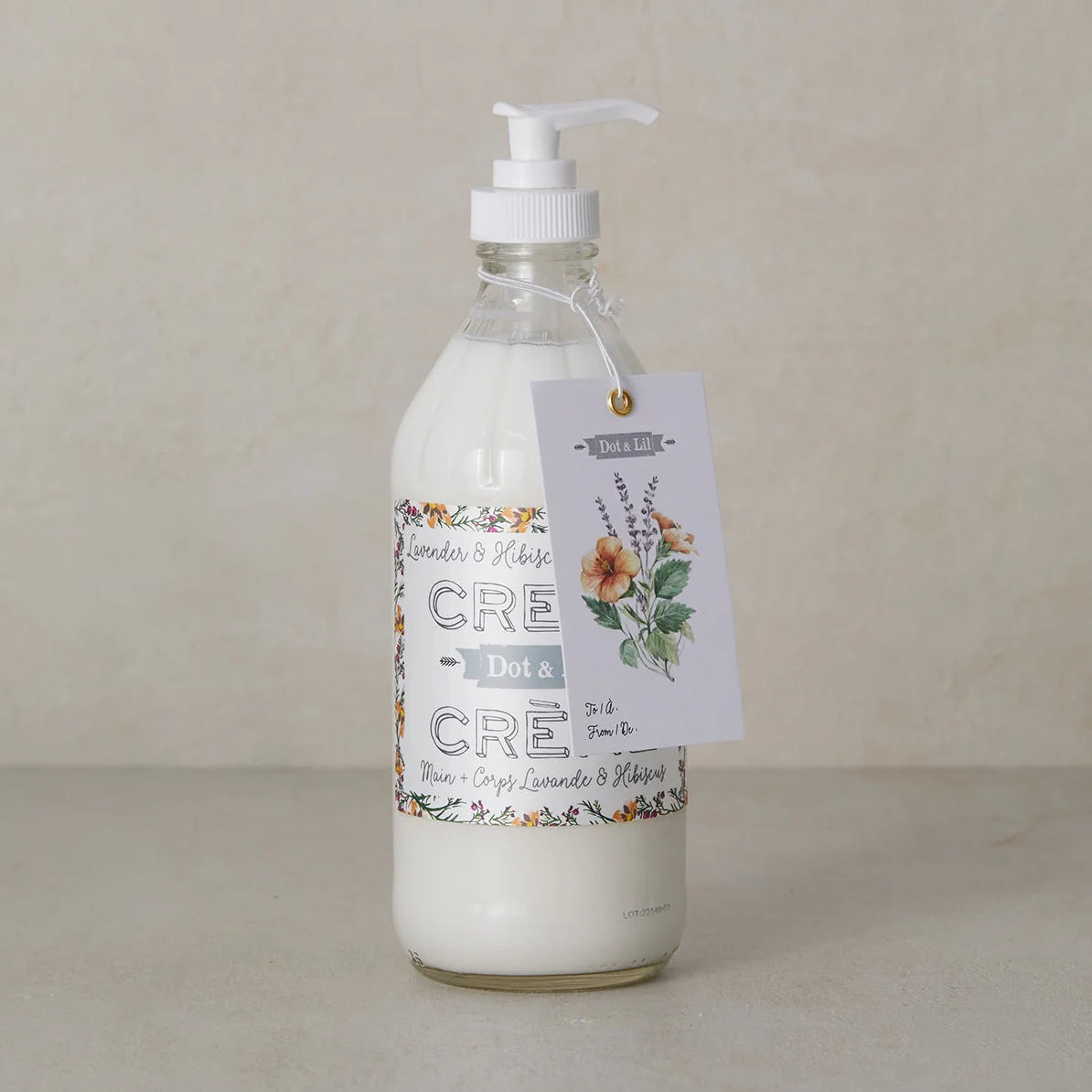 Les crèmes pour les mains et le corps Dot et Lil sont élaborées à partir d’une formule riche et nourrissante, à base de beurre de karité et d’huile de noix de coco, pour hydrater intensément la peau tout en la protégeant. Elles sont présentées dans une élégante bouteille en verre et accompagnées d’une jolie étiquette cadeau ornée d'une illustration florale.